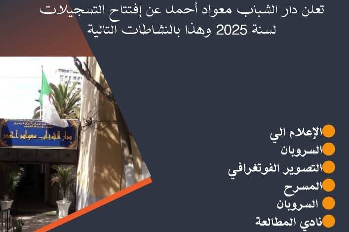 ترقبا لانطلاق الدخول النشطوي، شرعت مديرية الشباب والرياضة لولاية وهران، وبالتنسيق مع ديوان مؤسسات الشباب، في فتح باب التسجيل بمختلف المؤسسات الشبانية وذلك برسم الموسم الشباني.