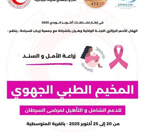 تنطلق غدا الاثنين 20 اكتوبر فعاليات المخيم الطبي الجهوي للدعم الشامل و التأهيل لمرضى السرطان على مستوى القرية المتوسطية بوهران و ذلك في حدث اسثتنائي هة الاول من نوعه بالولاية.